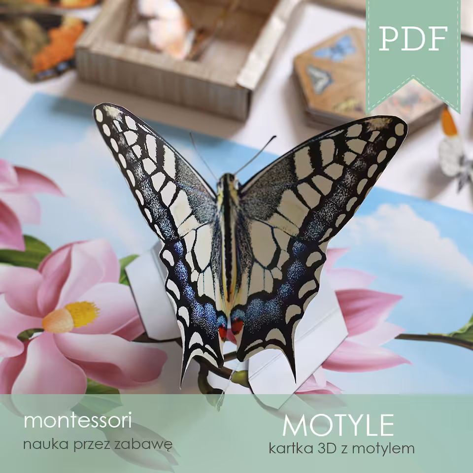 Kartka pop-up 3D z realistycznym motylem paziem królowej wraz z instrukcją wykonania do samodzielnego wydruku.
