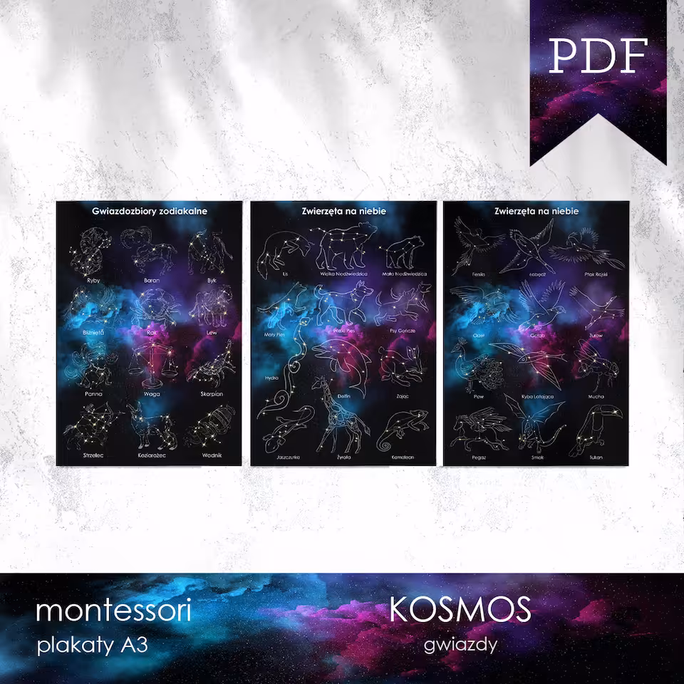 Plakaty z najpopularniejszymi gwiazdozbiorami, w tym zodiaki oraz zwierzęta.