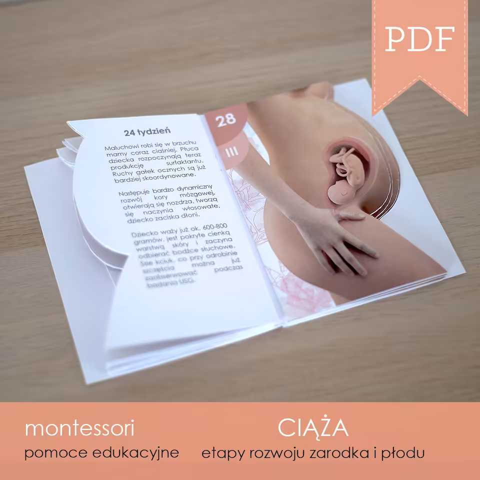 Karty edukacyjne oraz książeczka 3D z ilustracjami i opisami przebiegu ciąży i rozwoju zarodkowego i płodowego człowieka w poszczególnych tygodniach do samodzielnego wydruku.