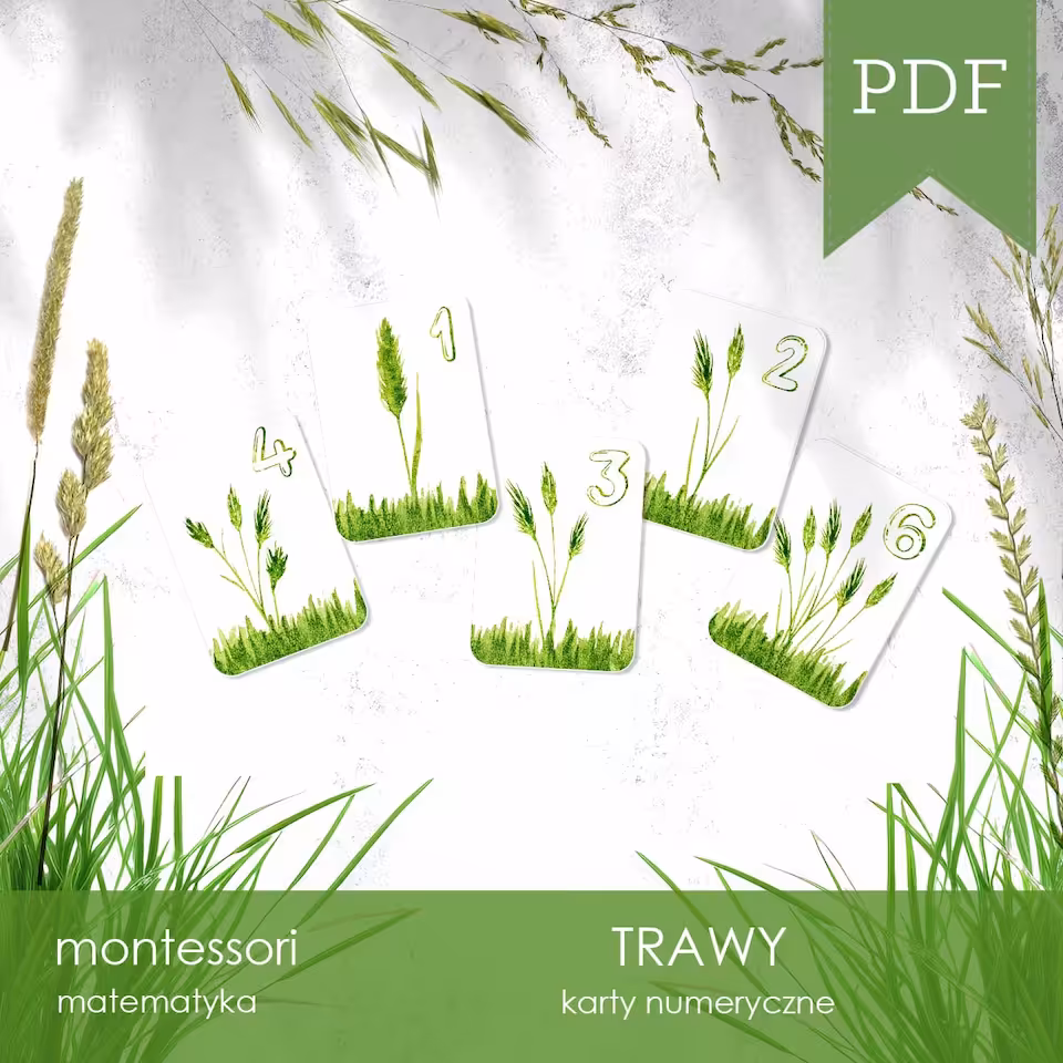 5. Karty numeryczne z ilustracjami traw oraz miejscem na układanie własnych skarbów zebranych na spacerze