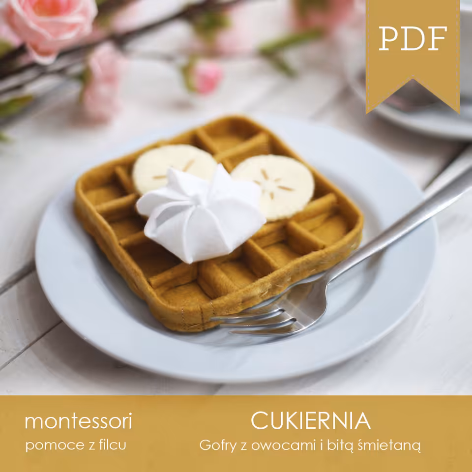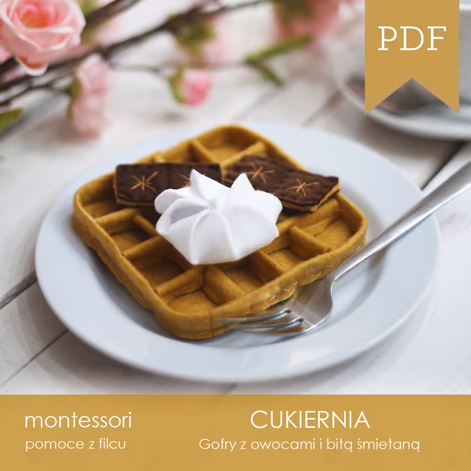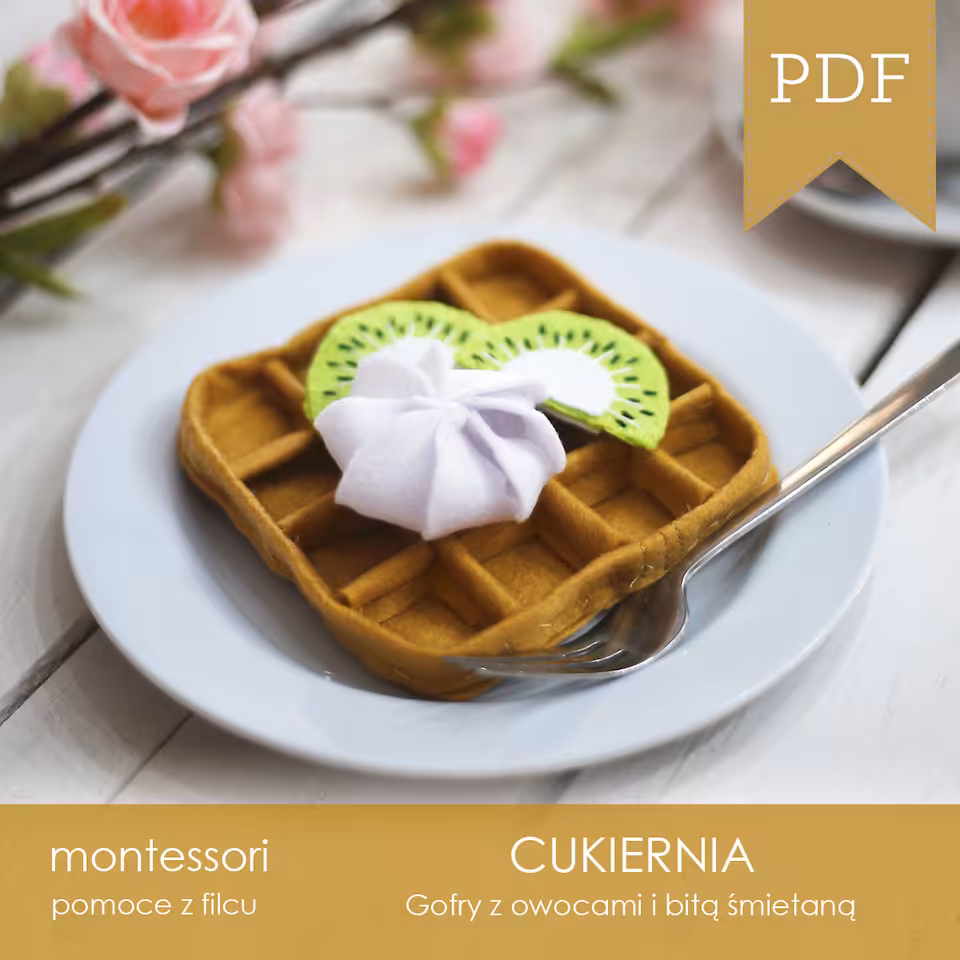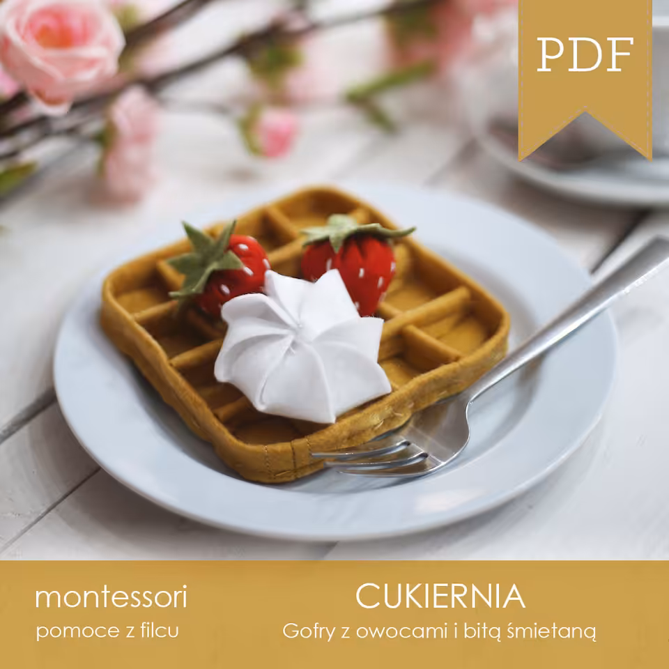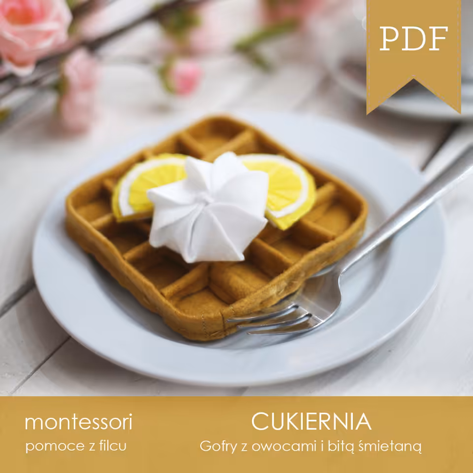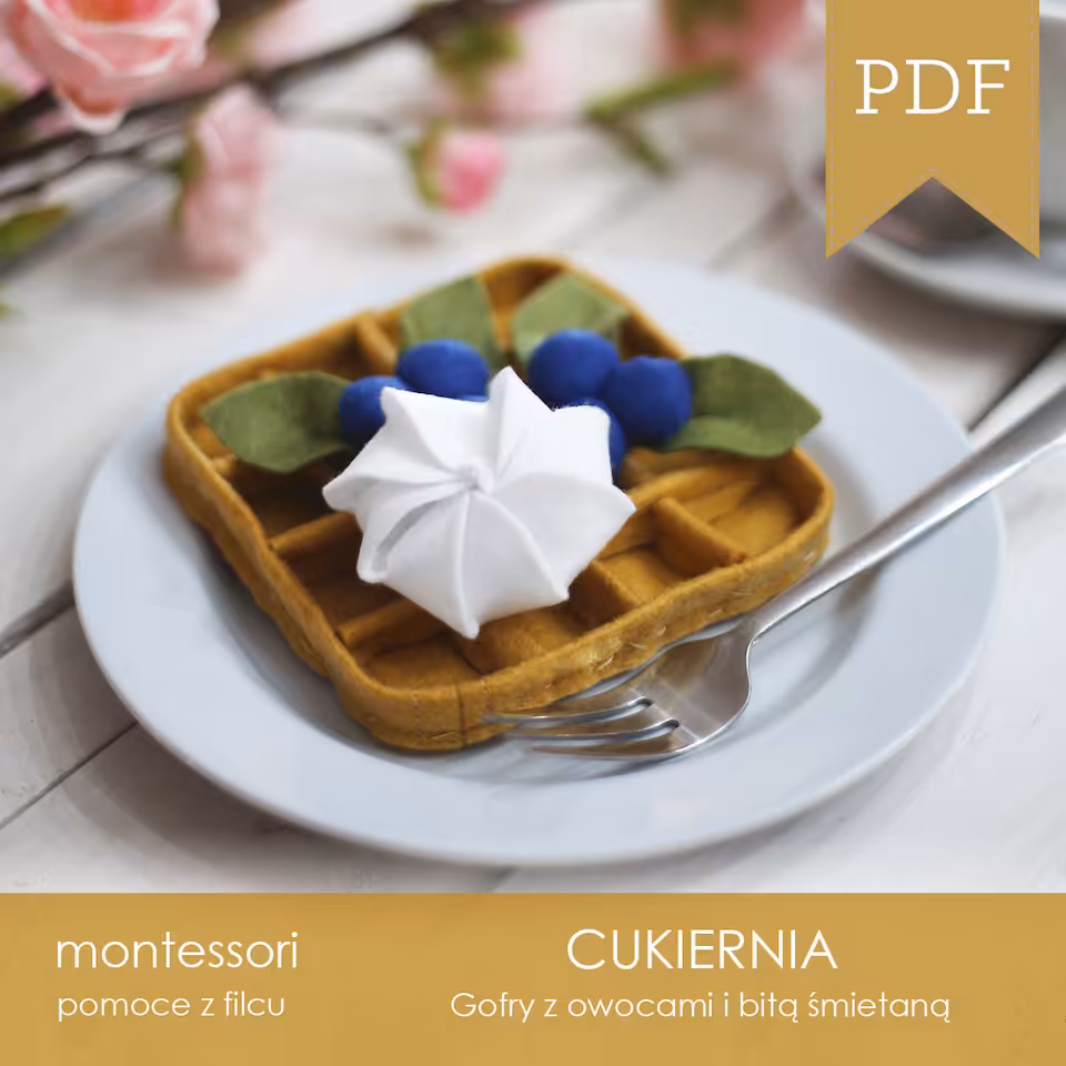 Szablon wraz ze szczegółową instrukcją z opisami i zdjęciami do samodzielnego wykonania gofra z owocami z filcu. W szablonie znajdziemy szczegółowe informacje na temat ilości i rodzaju filcu, kolorów nitek oraz wypełnienia dla jednego oraz dla sześciu gofrów. Zestaw zawiera szablony do wykonania gofrów z 8 różnymi dodatkami.