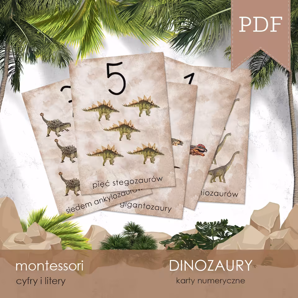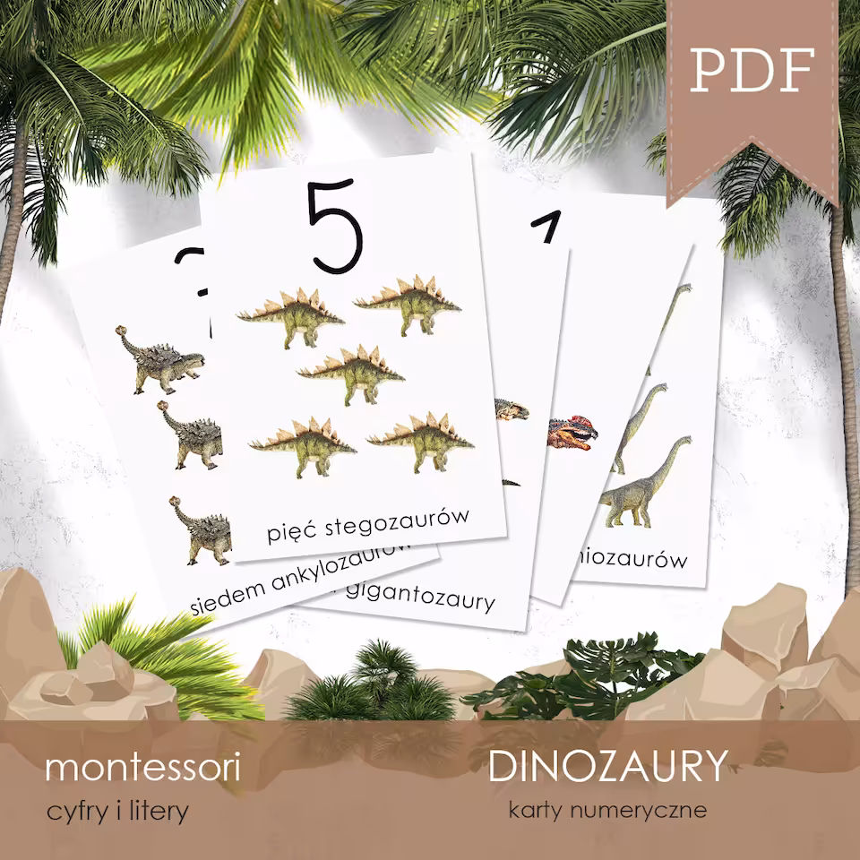 Nauka cyfr z dinozaurami czyli karty numeryczne z cyframi od 0 do 9 oraz 10 kart do samodzielnego pisania i liczenia dinozaurów.