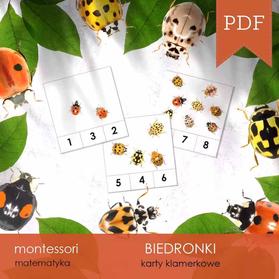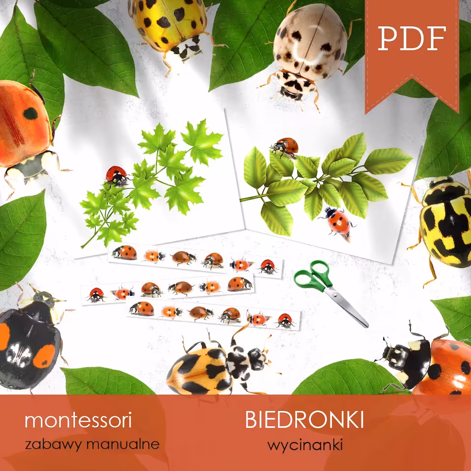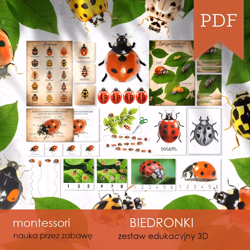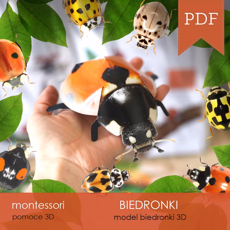 Zestaw edukacyjny 3D o tematyce BIEDRONEK, dzięki któremu poznamy 16 gatunków mniej i bardziej znanych biedronek, ich rozwój oraz budowę, będziemy tworzyć ich modele 3D, liczyć wspólnie z nimi, wycinać i rysować, a to wszystko pośród 12 zadań edukacyjnych, plastycznych, manualnych, logicznych i zręcznościowych na 100 arkuszach A4 i A3 do samodzielnego wydruku.