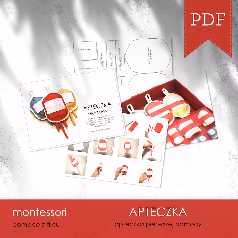 Załączone 30 arkuszy szablonów można odrysować bezpośrednio na 30 arkuszach A4 filcu we wskazanych kolorach i stworzyć apteczkę widoczną na zdjęciach.