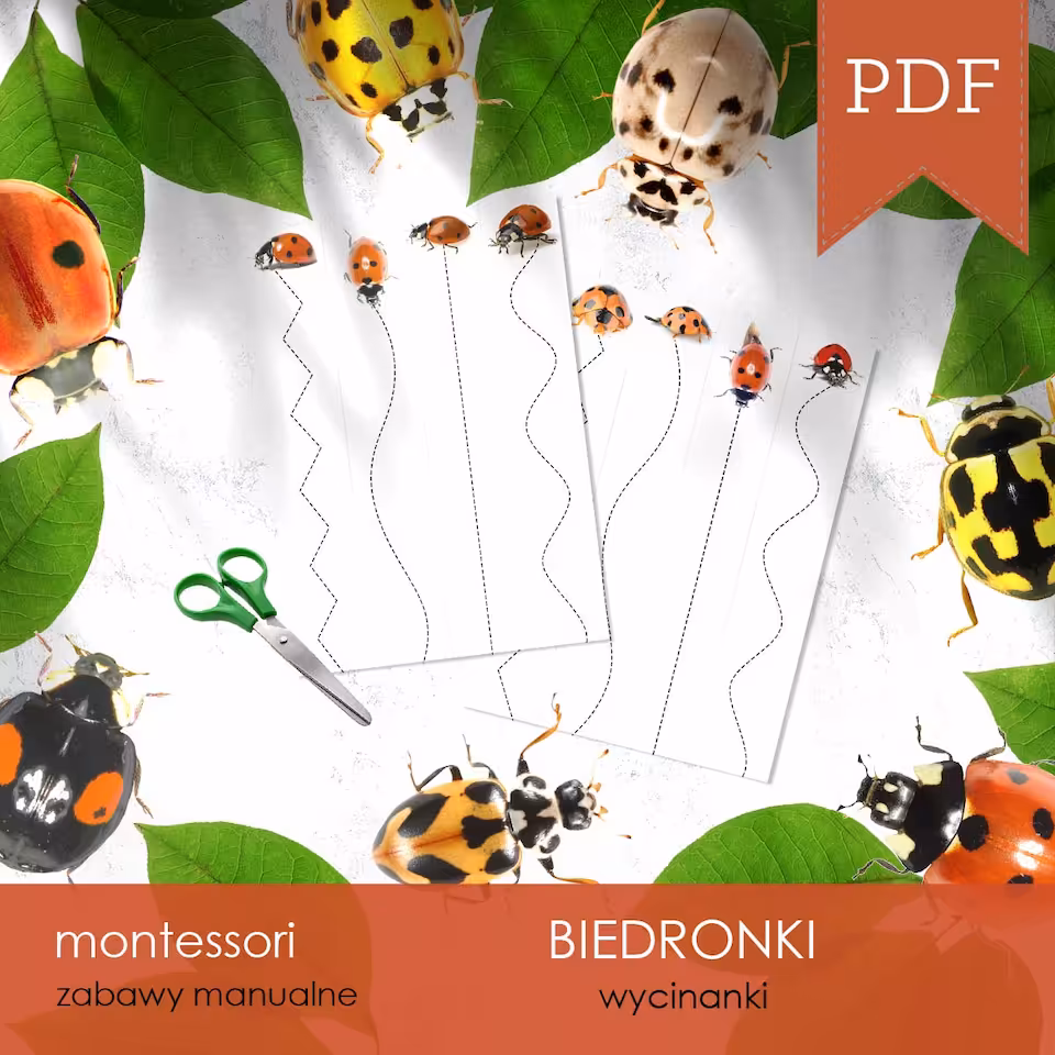 Wycinanki przyklejanki z motywem biedronek na różnych rodzajach liści oraz pasków do wycinania po śladzie.