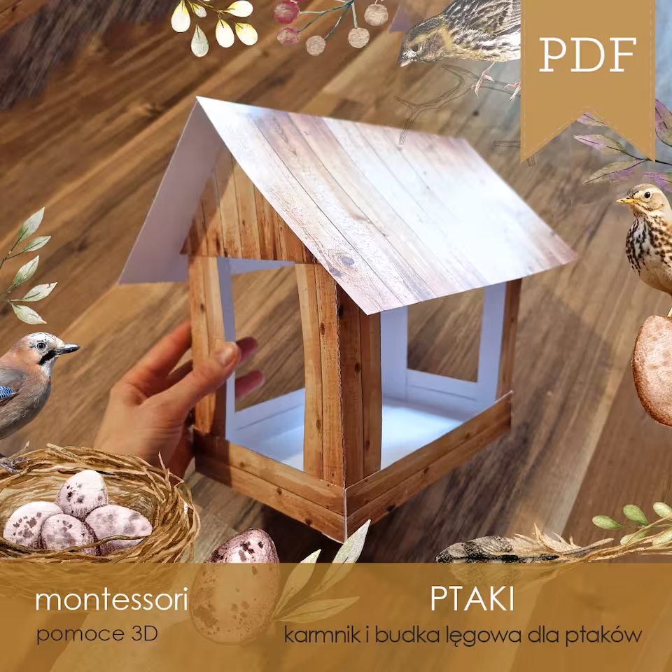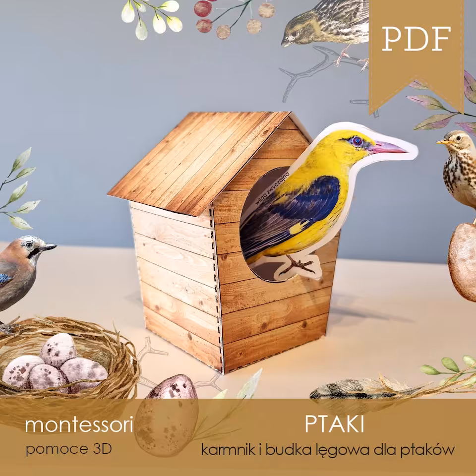 Makieta 3D karmnika oraz budek lęgowych wraz z 64 gatunkami ptaków 3D do samodzielnego wycięcia i sklejenia, dodatkowo budki lęgowe można samodzielnie pokolorować.