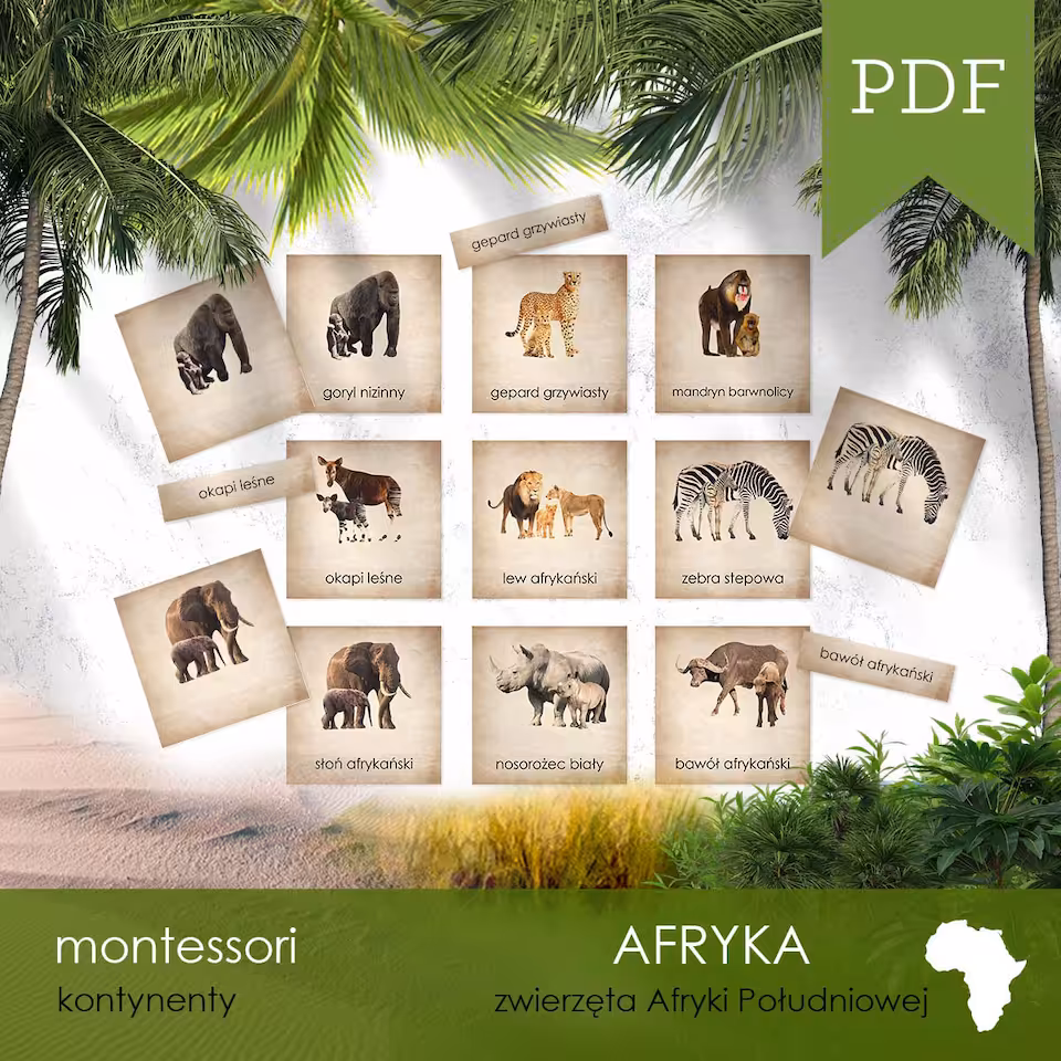 Karty edukacyjne trójdzielne o tematyce zwierząt afrykańskich z podziałem na: