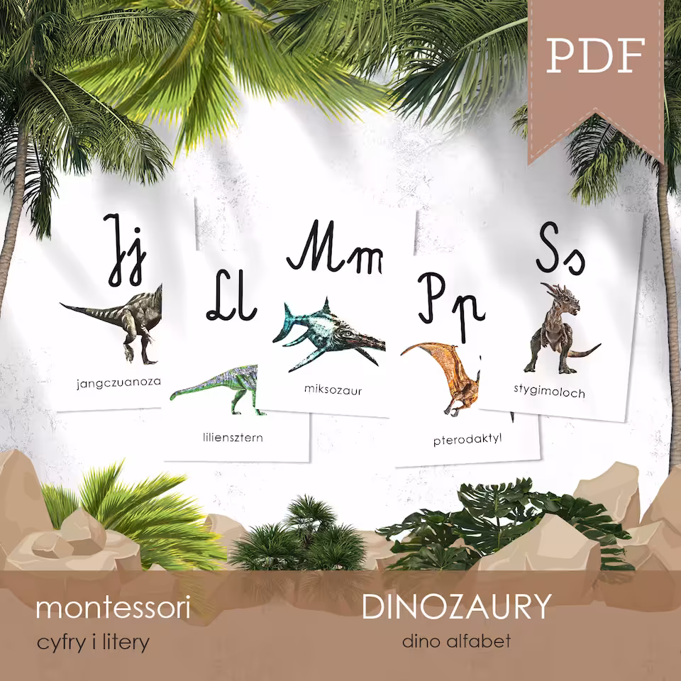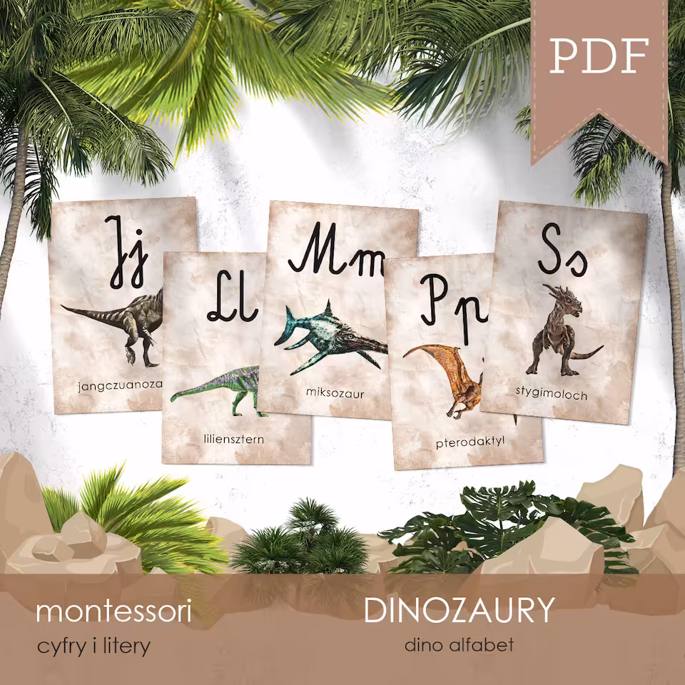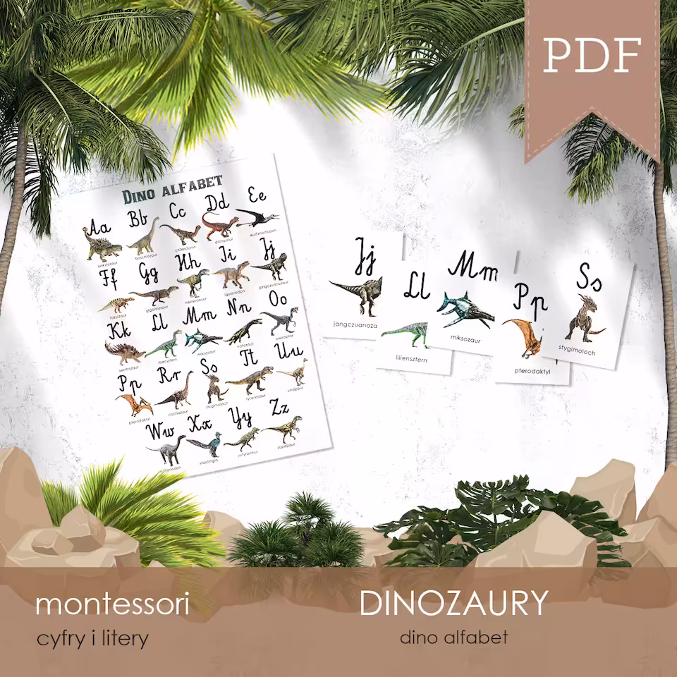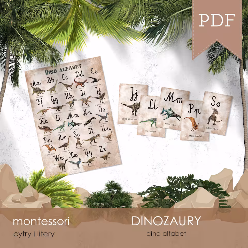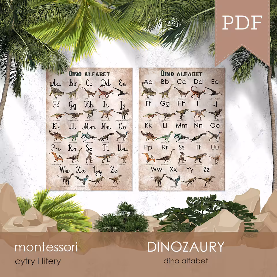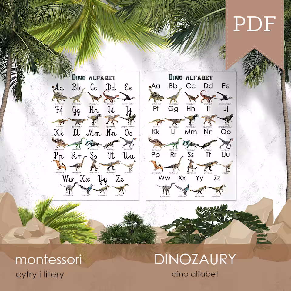 Plakat w formacie A3 oraz karty edukacyjne w formacie A6 z literami polskiego alfabetu, którym towarzyszą odpowiadające im nazwą dinozaury. Do wyboru jest czcionka pisana i drukowana, a wszystkie plakaty i karty dostępne są w wersji z tłem i bez tła.