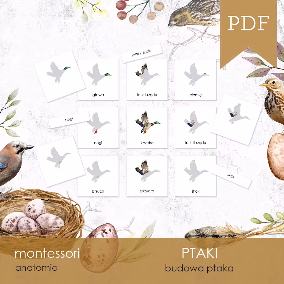 Materiał jest częścią 412-arkuszowego, 12-zadaniowego zestawu edukacyjnego PTAKI - Zestaw edukacyjny 3D i jest kompatybilny z 84-arkuszowym, 6-zadaniowym zestawem PIÓRA PTAKÓW - Zestaw edukacyjny 3D oraz 44-arkuszowym, 6-zadaniowym zestawem JAJA PTAKÓW - Zestaw edukacyjny 3D.