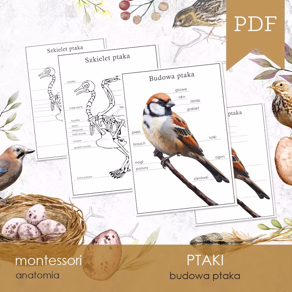 Plansze edukacyjne z budową ptaka, jego budową zewnętrzną oraz szkieletem na podstawie wróbla. W skład zestawu wchodzą też plansze do uzupełniania opisów.