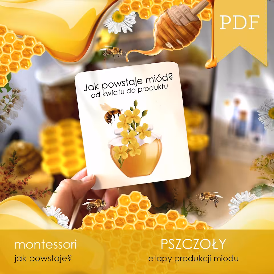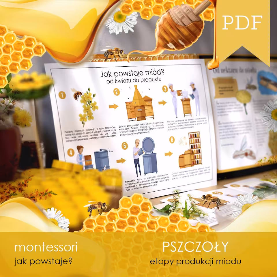 Plansza edukacyjna oraz karty pracy obrazujące etapy powstawania miodu. Zestaw zawiera 3 arkusze A4 do samodzielnego wydruku.