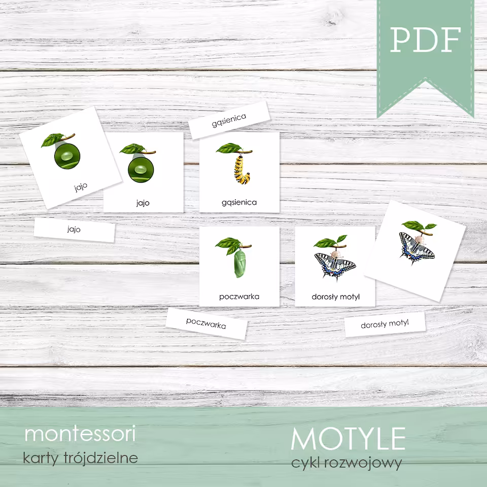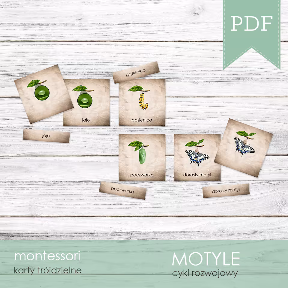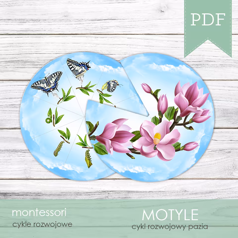 Obrotowy cykl rozwojowy motyla jest częścią oferty MOTYLE - Zestaw edukacyjny 3D składającego się z 12 zadań na 210 arkuszach do druku.