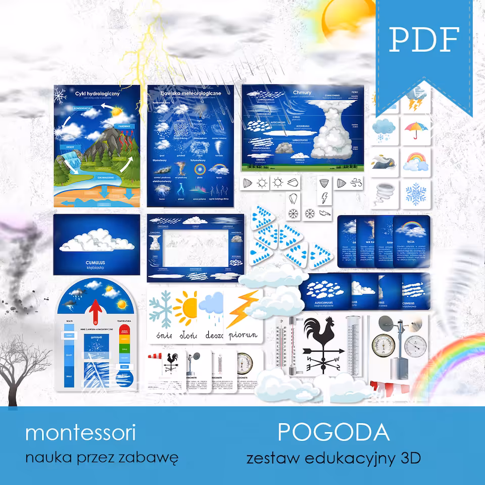 Zestaw edukacyjny o tematyce POGODY i zjawisk z nią związanych, ze szczególnym uwzględnieniem obiegu wody w przyrodzie, jej odmiennych stanów, które możemy obserwować o różnych porach roku i rodzajów chmur, które nauczymy się nazywać dzięki samodzielnie wykonanym łapaczom chmur. W zestawie znajdziemy stację pogodową, która nauczy nas nazywać obserwowane za oknem zjawiska, poznamy też przyrządy meteorologiczne służące do obserwacji i oceny zjawisk pogodowych.