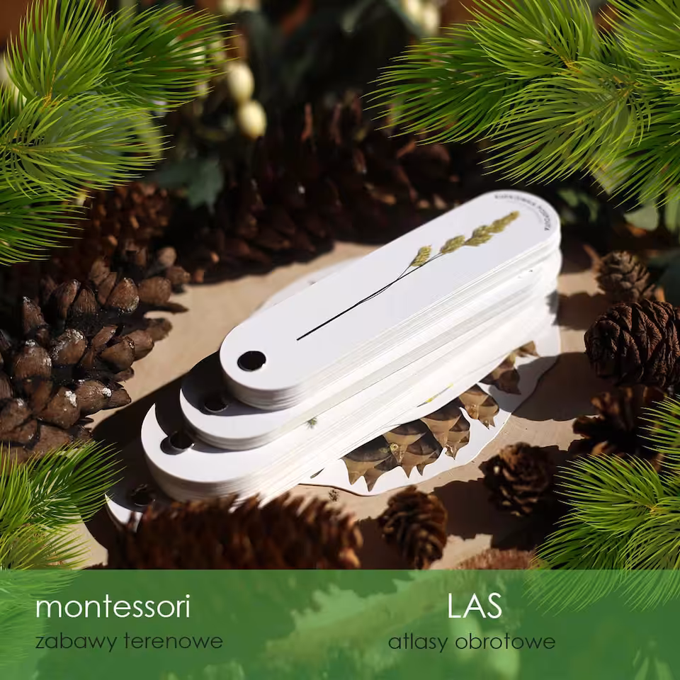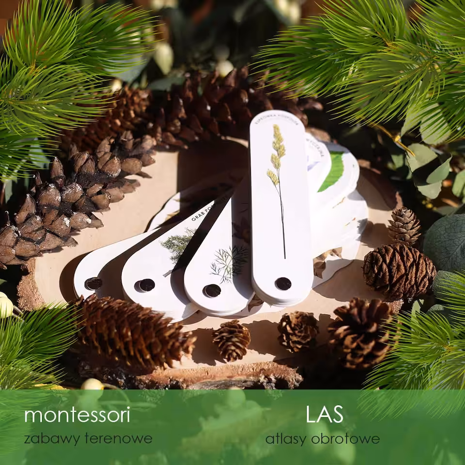 Atlas obrotowy do identyfikacji szyszek z 12 różnych gatunków drzew iglastych. Zdjęcia w atlasie odwzorowują wymiary szyszek 1:1, dzięki czemu jeszcze łatwiej je identyfikować.