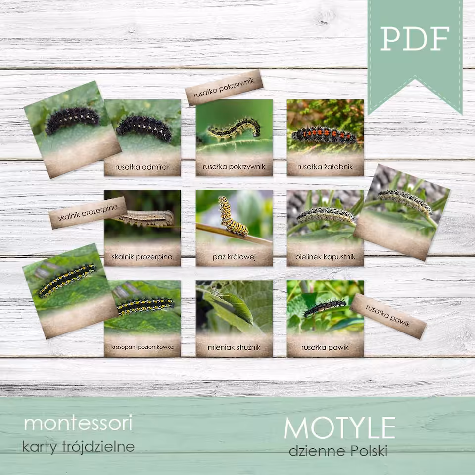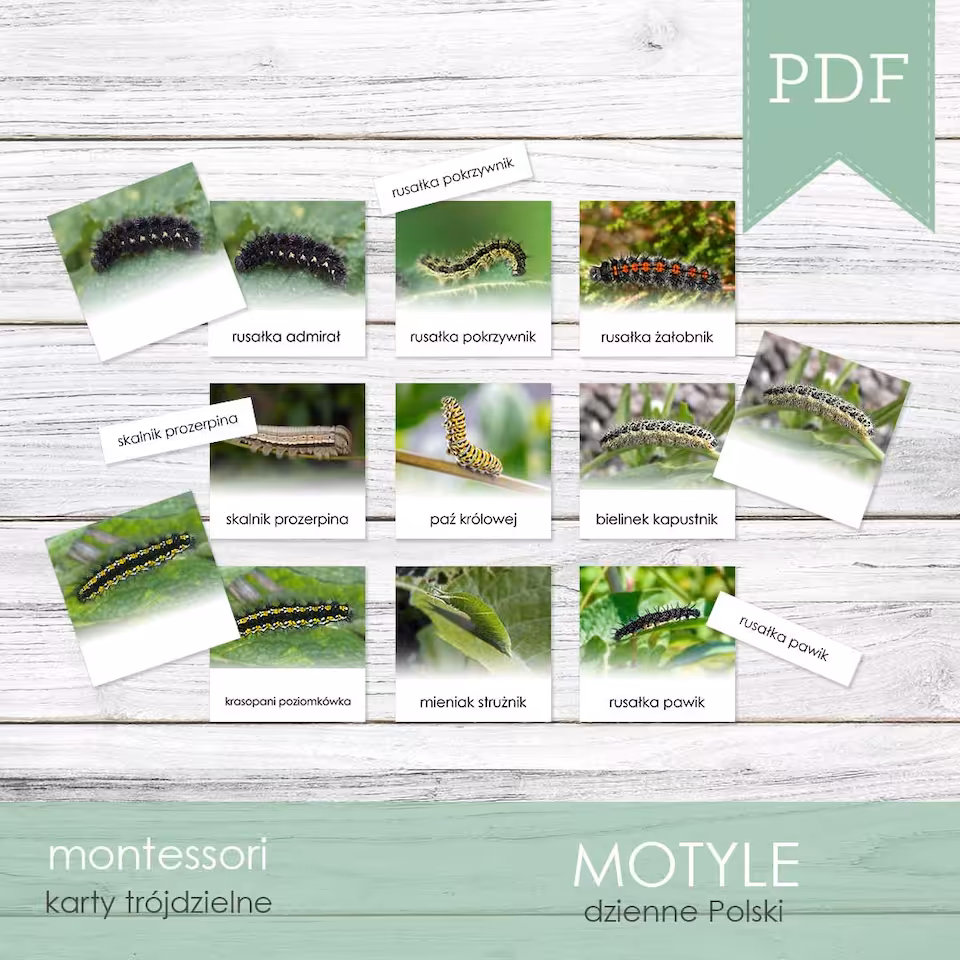 Zestaw zawiera 120 elementów w postaci 40 kompletów kart trójdzielnych o tematyce gąsienic 20 motyli dziennych Polski. Do wyboru jest wersja z tłem i bez tła zgodna z PIM. Pojedynczy zestaw zawiera kartę z opisem, kartę bez opisu i oddzielny opis.