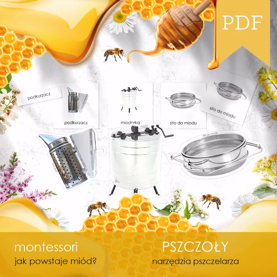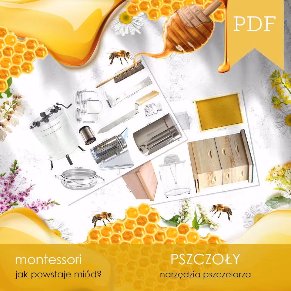 Zestaw narzędzi wykorzystywanych przez pszczelarzy oraz karty edukacyjne trójdzielne.