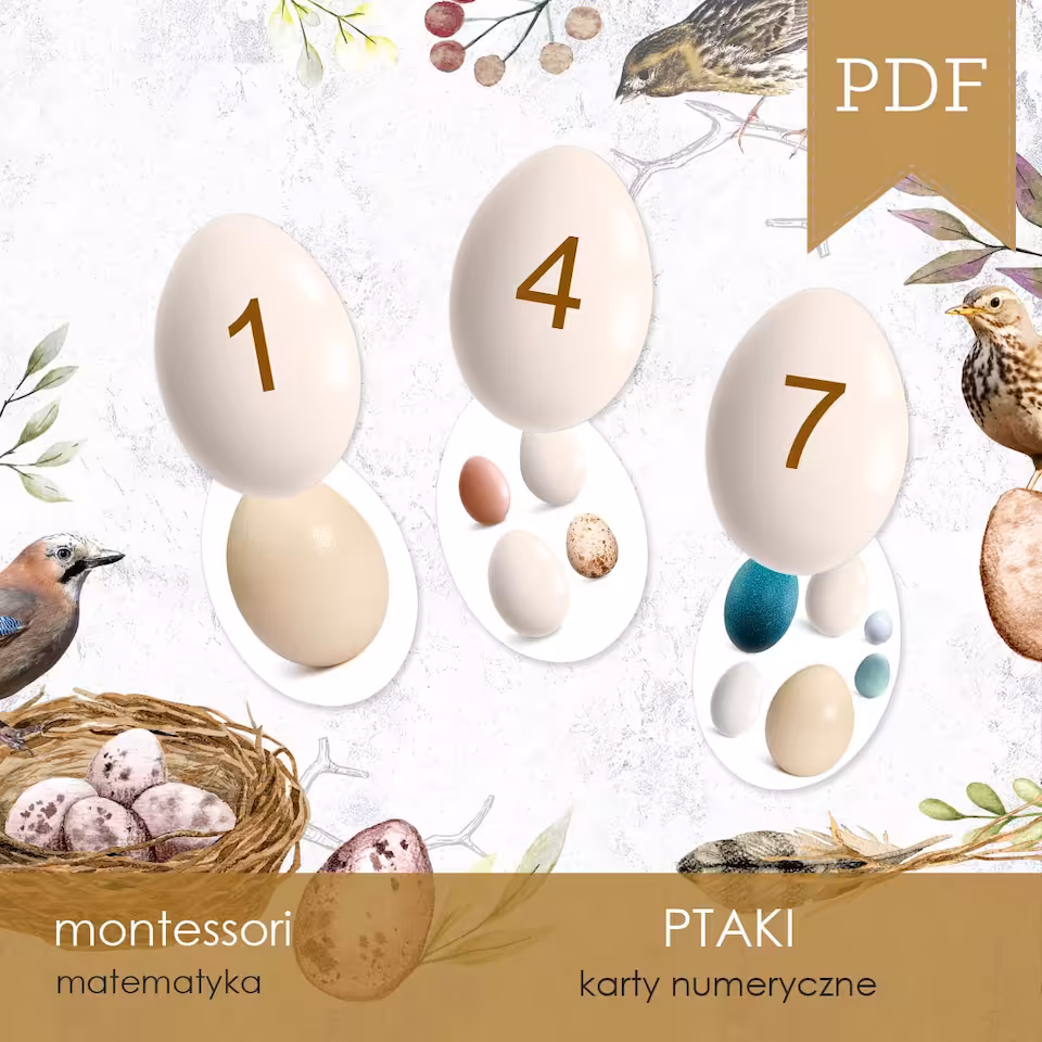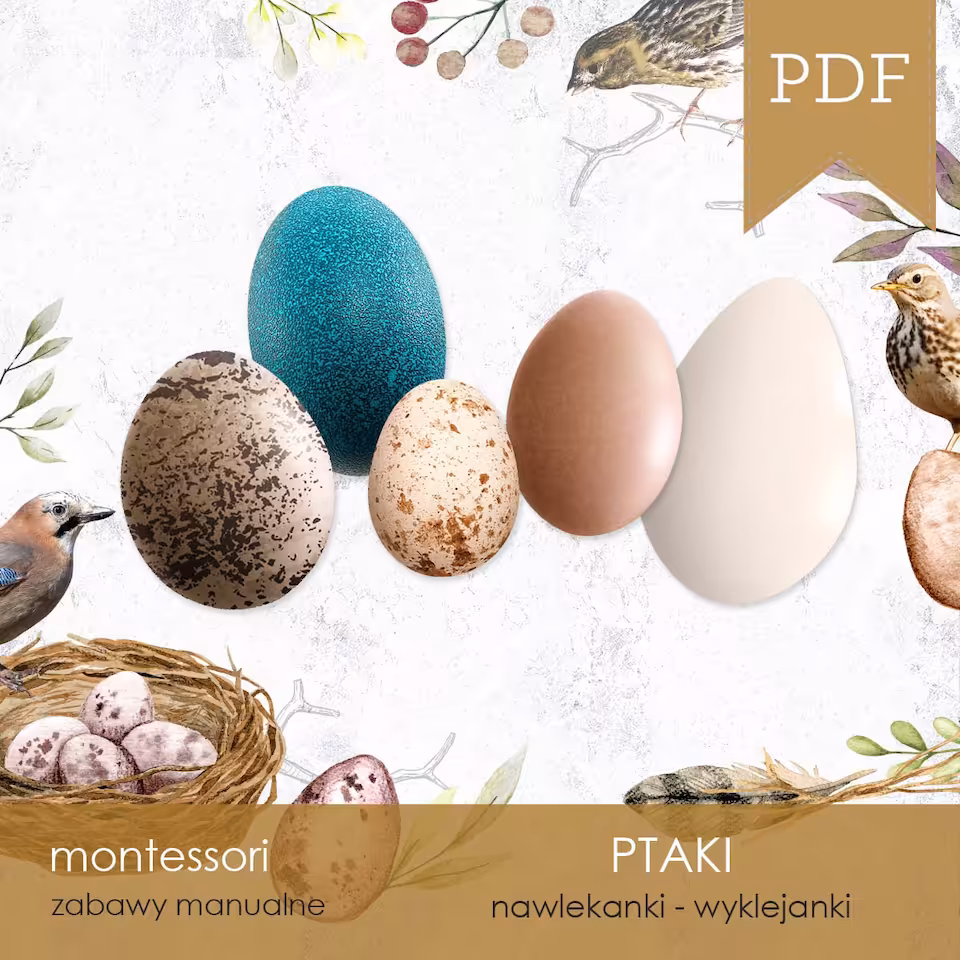 Zestaw edukacyjny, dzięki któremu nauczymy się identyfikować ptaki na podstawie ich jaj, dzięki plakatowi przedstawiającemu jaja 16 najpopularniejszych ptaków w ich rzeczywistym rozmiarze oraz kartom edukacyjnym z wizerunkami ptaków i ich jaj. Dodatkowo poznamy budowę jaja i cykl życiowy ptaka, pobawimy się w detektywa i nauczymy cyfr, a na koniec stworzymy kreatywny pióropusz z piór, a to wszystko pośród 44 arkuszy zgrupowanych w 6 zadań do samodzielnego wydruku na arkuszach A4 i A3.
