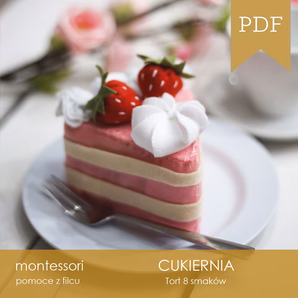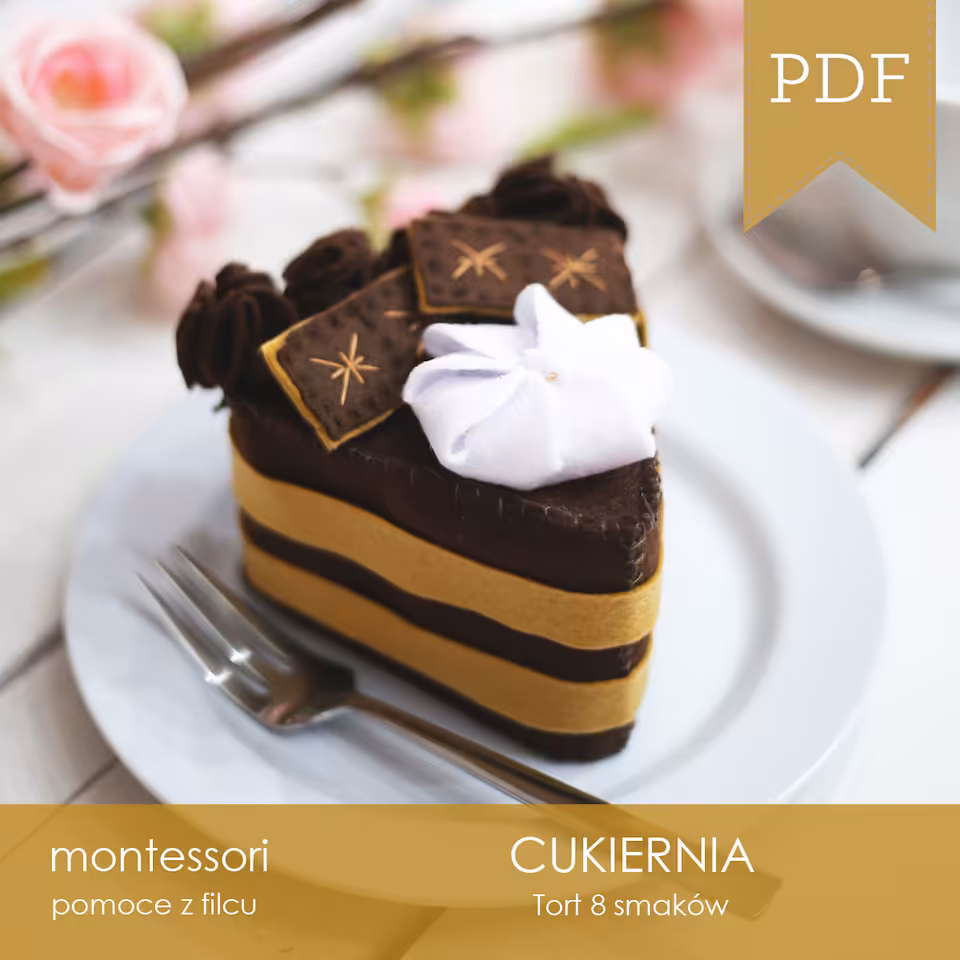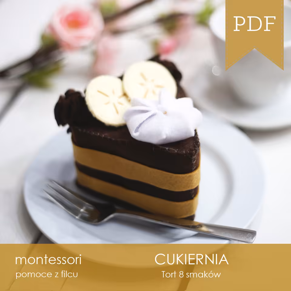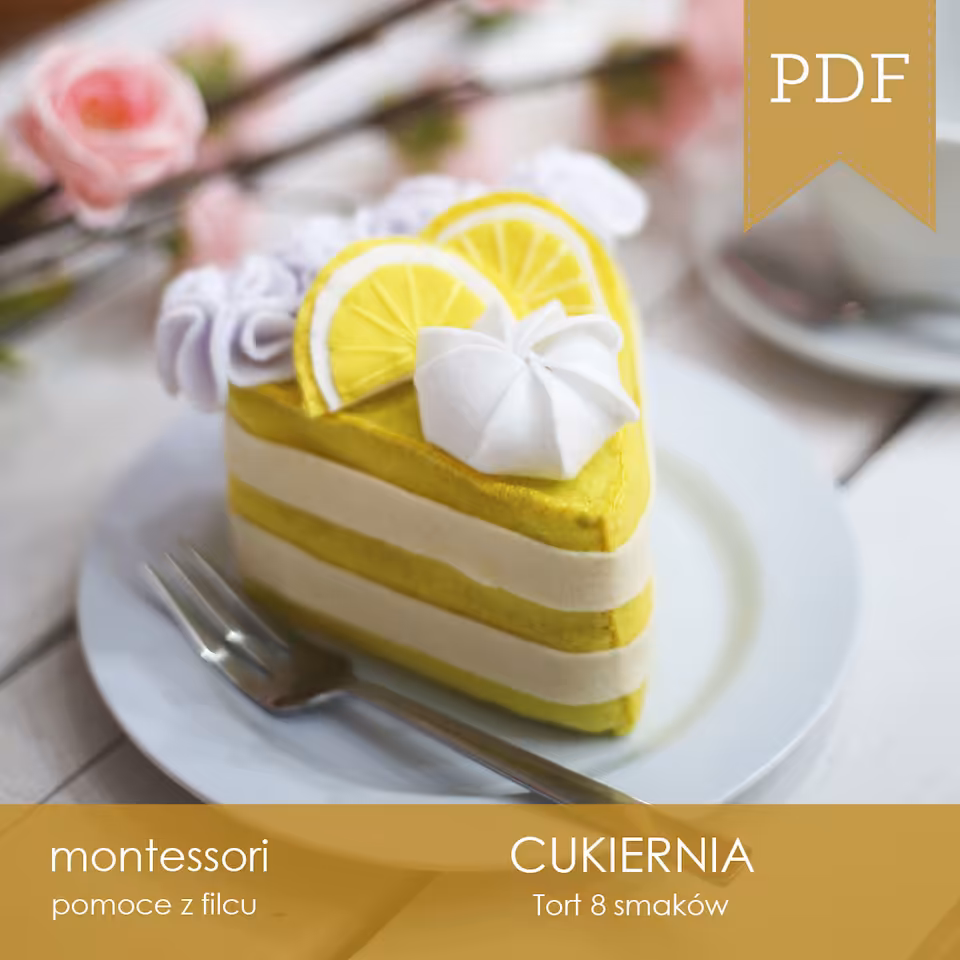 Szablon wraz ze szczegółową instrukcją z opisami i zdjęciami do samodzielnego wykonania tortu z filcu. W szablonie znajdziemy szczegółowe informacje na temat ilości i rodzaju filcu, kolorów nitek oraz wypełnienia dla jednej porcji oraz dla sześciu porcji. Zestaw zawiera szablony i instrukcje do wykonania tortu w 8 różnych smakach z 8 różnymi dodatkami oraz bitą śmietaną.