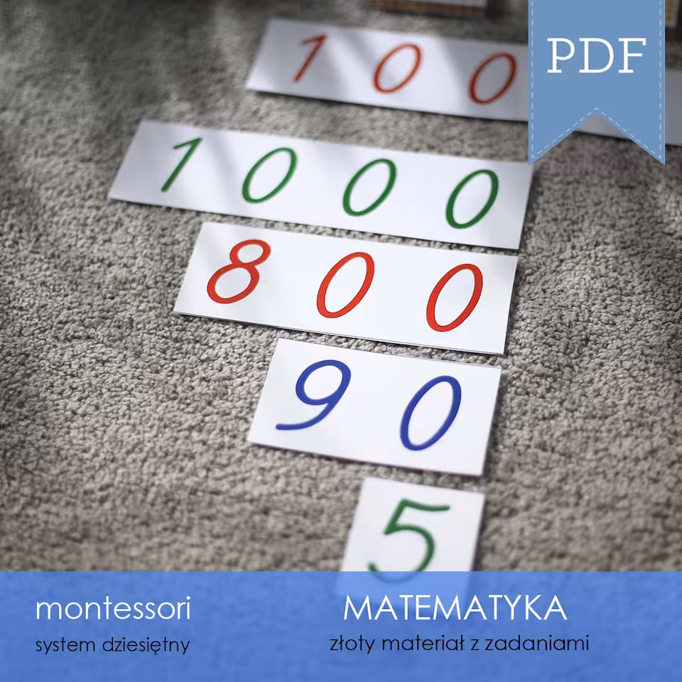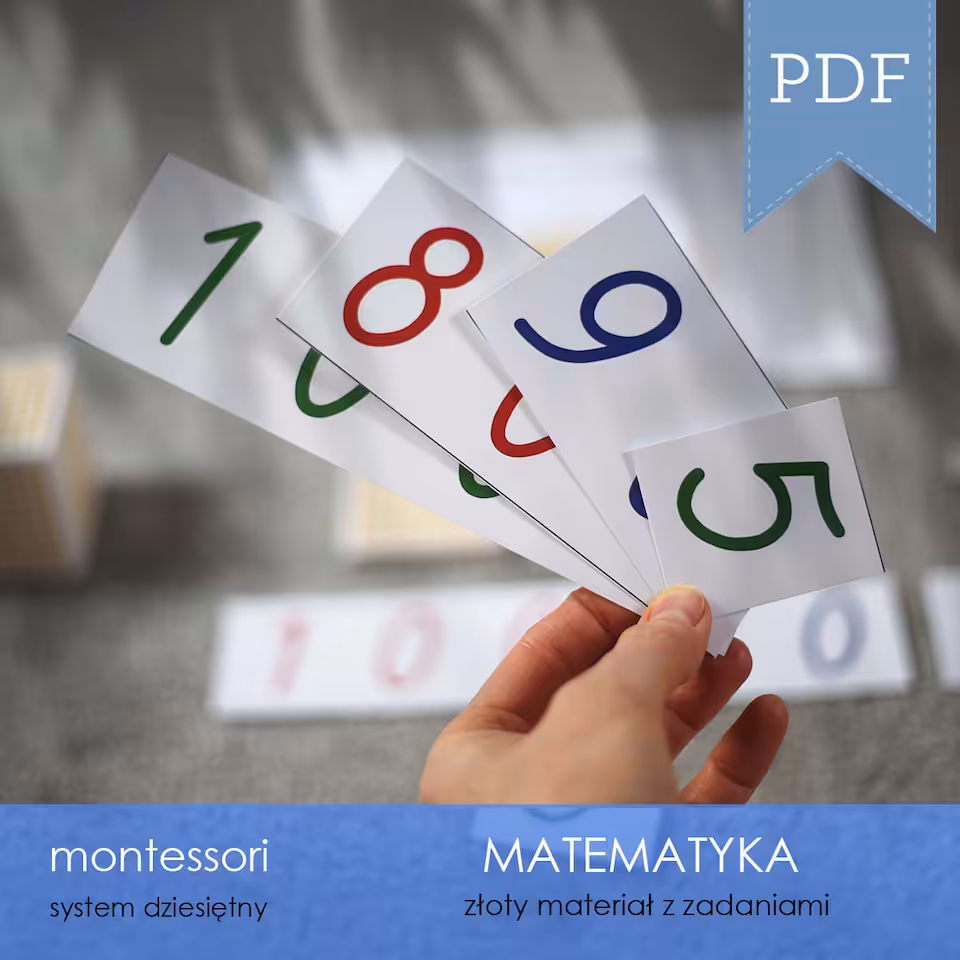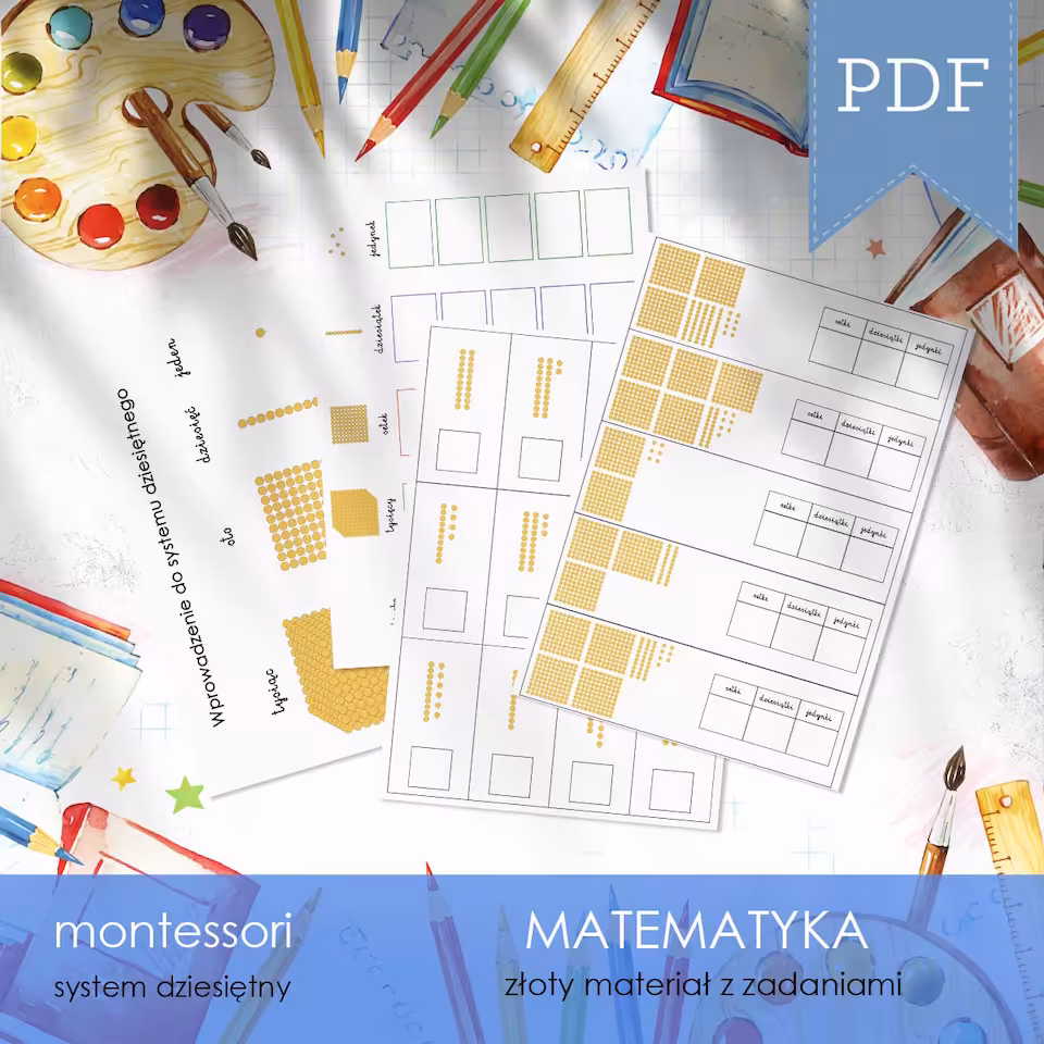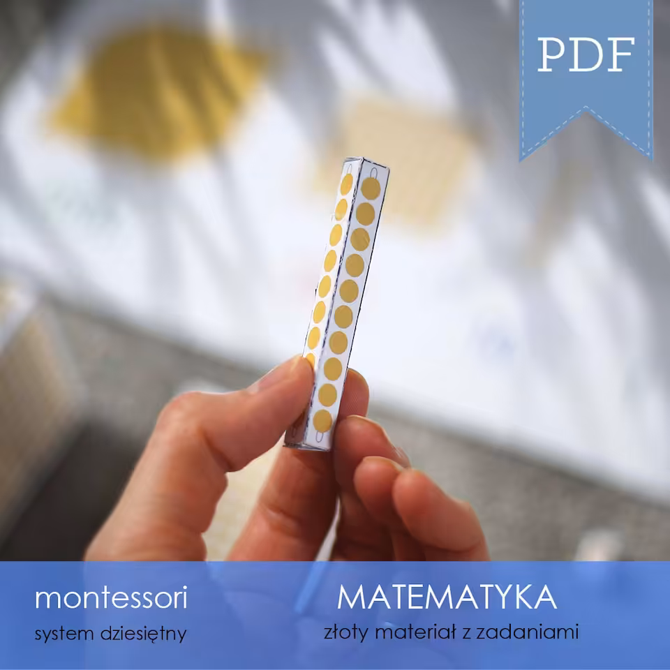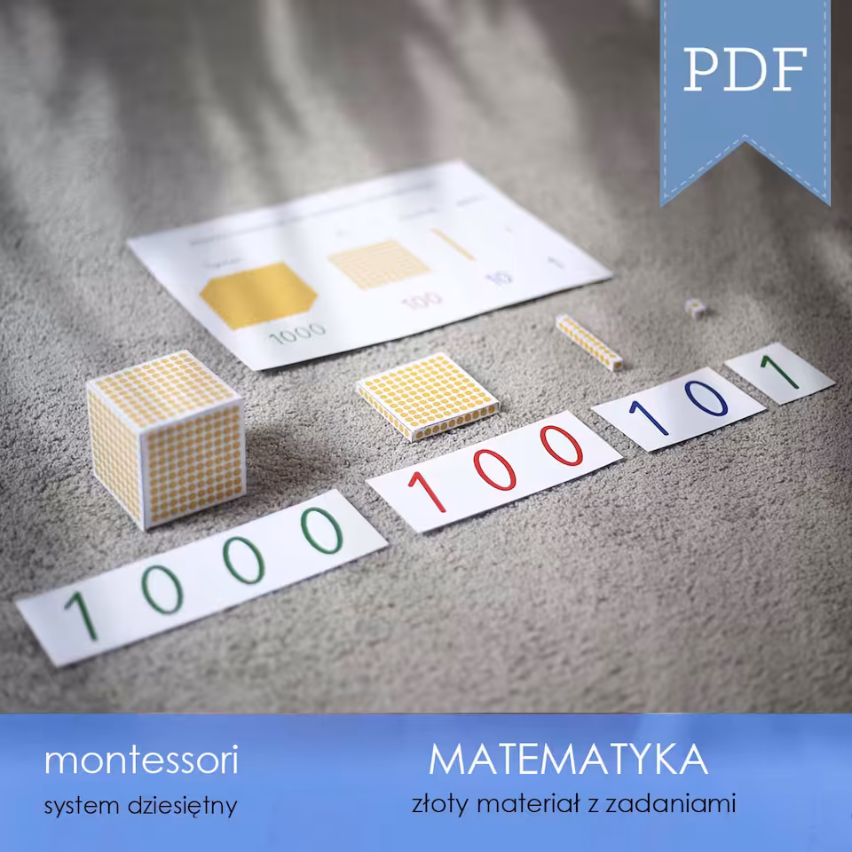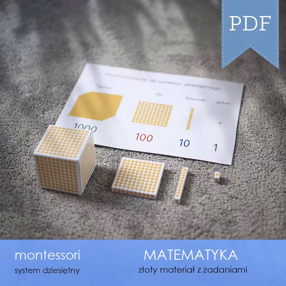 System dziesiętny do samodzielnego wydruku, wycięcia i sklejenia, w skład którego wchodzą kostki z tysiącem oczek, setki, dziesiątki oraz jedynki, liczby od 1 do 900 oraz plansza z wprowadzeniem do systemu dziesiętnego. W skład zestawu wchodzą też zadania, które można rozwiązać z użyciem gotowego złotego materiału. Zestaw zawiera 24 arkusze A4 do samodzielnego wydruku. Poszczególne arkusze mogą być drukowane wielokrotnie w celu uzyskania dowolnej ilości kostek z oczkami.