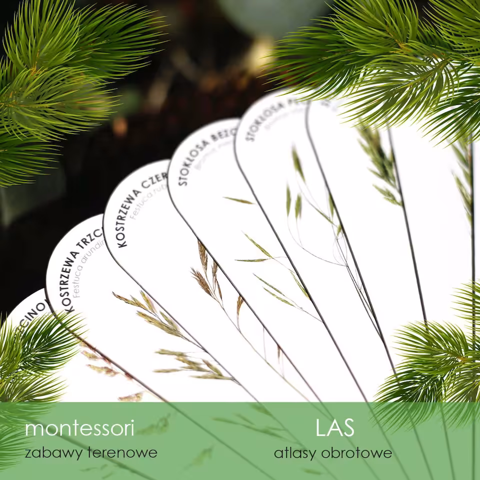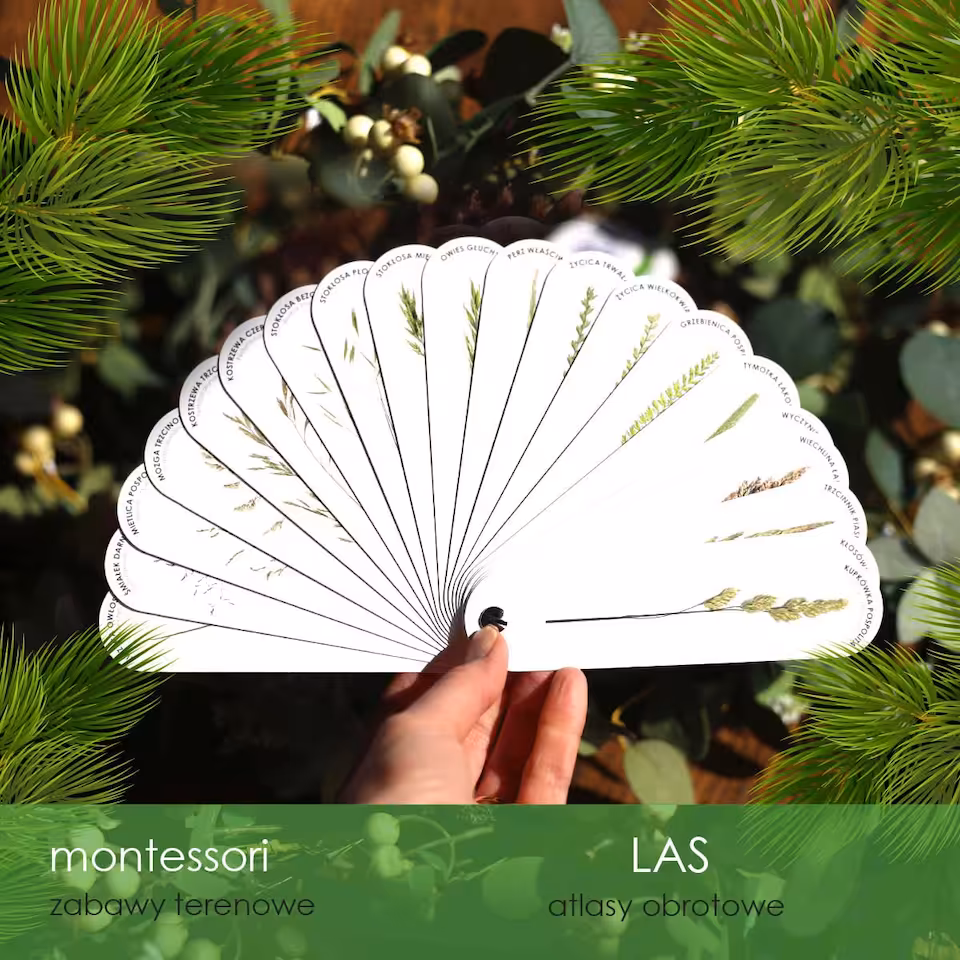 Atlas obrotowy do identyfikacji 20 różnych gatunków traw polnych i leśnych rosnących dziko w Polsce, doskonały do zabierania na spacery do lasu i parku, dzięki czemu łatwiej rozpoznać spotykane tam rośliny jednoliścienne.