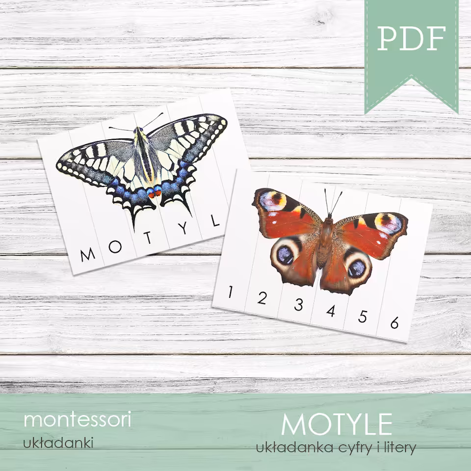 Puzzle z cyframi i literami z motywem motyli dziennych Polski, w skład zestawu wchodzi 8 kart z puzzlami.